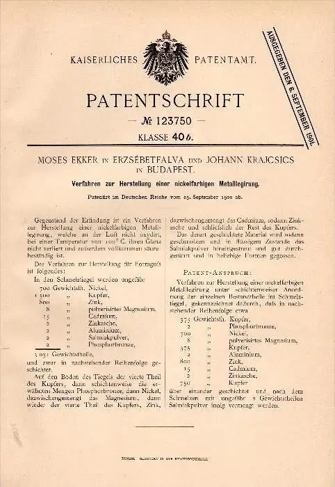 Original Patentschrift - Moses Ekker in Erzsébetfalva , 1900 , nickelfarbigen Metalllegierung J. Krajcsics in Budapest