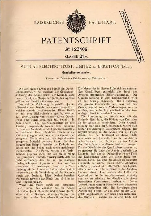 Original Patentschrift - Mutual Electric Trust Ltd. in Brighton ,1900, Voltmeter aus Quecksilber , Quecksilbervoltameter