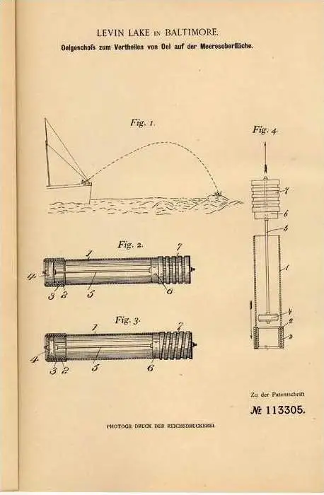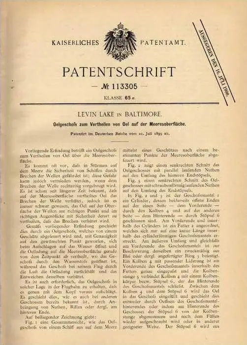 Original Patentschrift - Oelgeschoß zum Vertheilen von Öl im Meer , 1899 , L. Lake in Baltimore !!!