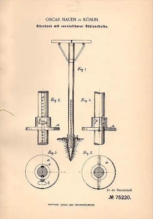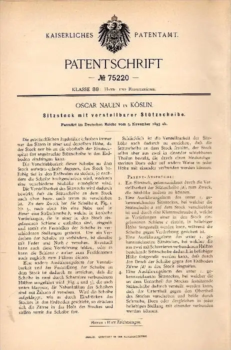 Original Patentschrift - Oscar Nauen in Köslin / Koszalin , 1893 , verstellbarer Sitzstock , Jagd , Schemel , Cöslin !!