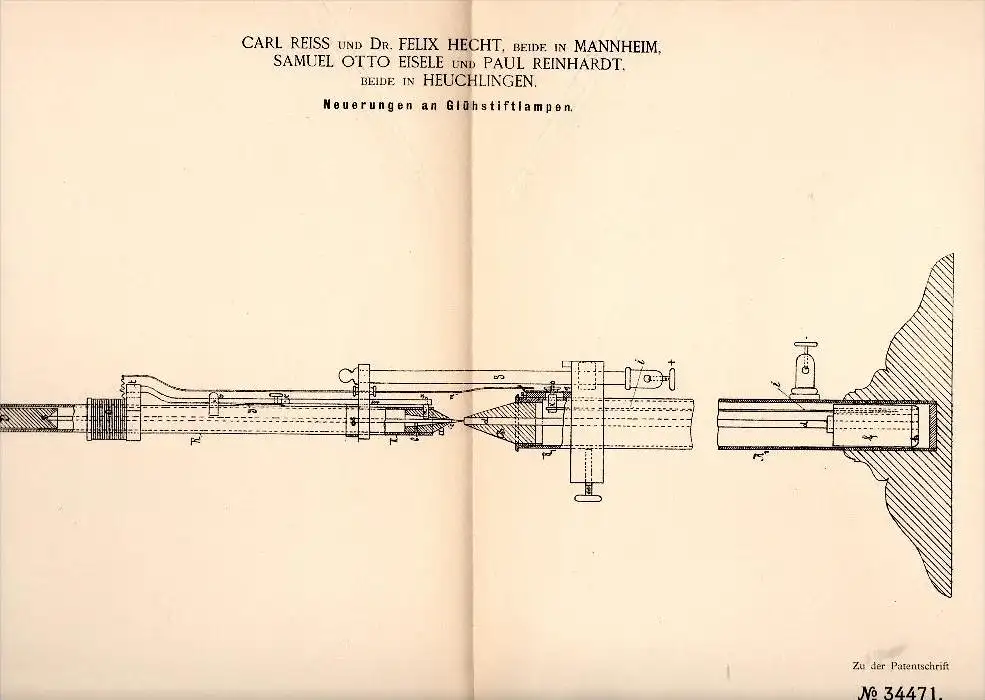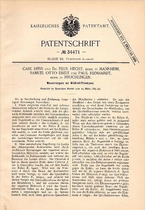 Original Patentschrift - Otto Eisele und P. Reinhardt in Heuchlingen , 1885 , Glühlampe , Lampe , C. Reiss und F. Hecht