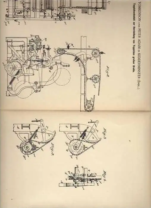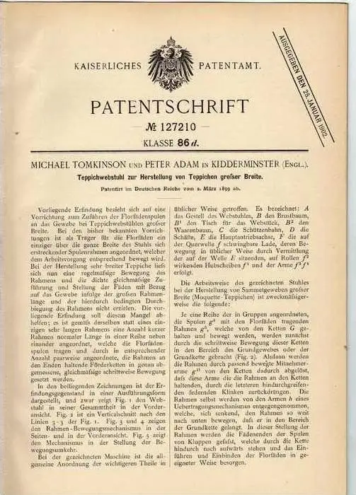 Original Patentschrift - P. Adam in Kidderminster , 1899 , Webstuhl für Teppich , Weberei !!!