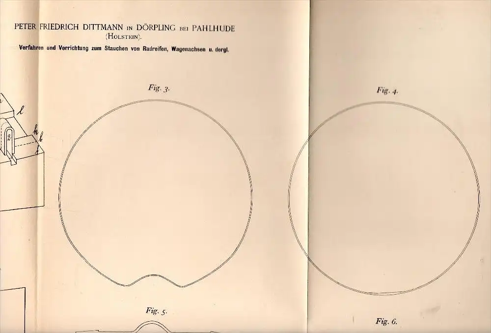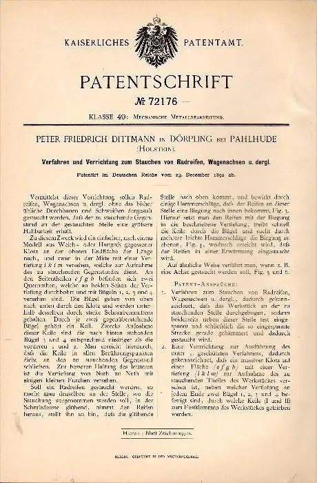Original Patentschrift -P. Dittmann in Dörpling bei Pahlhude , 1892 , Apparat zum Stauchen von Wagenachsen , Pahlen !!
