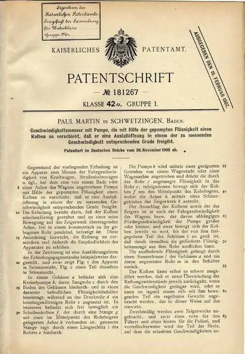 Original Patentschrift - P. Martin in Schwetzingen , Baden 1905, Tachometer , Geschwindigkeitsmesser mit Pumpe , Tacho !