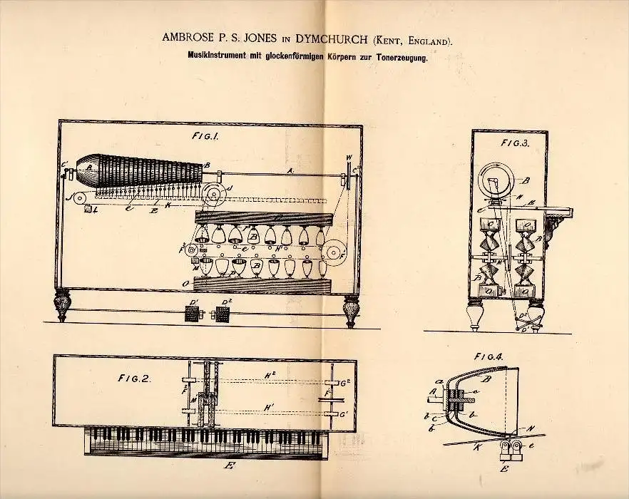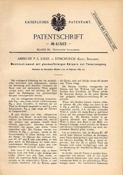 Original Patentschrift - P.S. Jones in Dymchurch , Kent , 1887 , Musical instrument with bells !!!