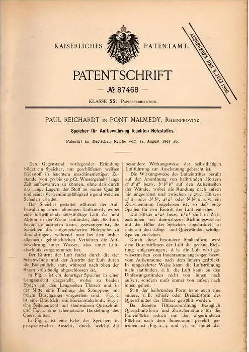 Original Patentschrift - Paul Reichardt in Pont Malmedy , 1895 , Speicher für feuchtes Holz , Sägewerk , Tischlerei !!!