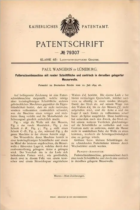 Original Patentschrift - Paul Wangerin in Lüneburg , 1894 , Futter - Schneidmaschine , Landwirtschaft , Agrar, Bauer !!!