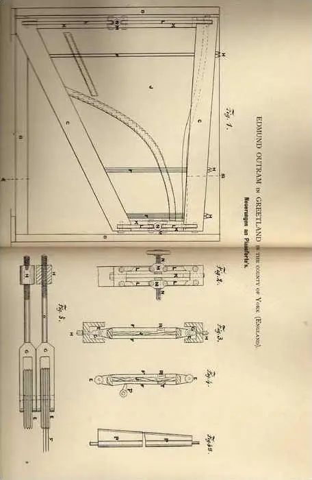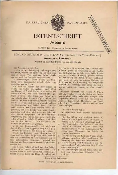 Original Patentschrift - Piano , Pianoforte , 1882 , E. Outram in Greetland , England !!!