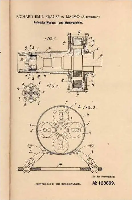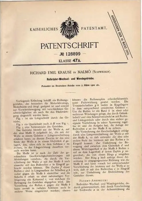 Original Patentschrift - R. Krause in Malmö , 1901 , Reibräder Wechsel- und Wendegetriebe , Getriebe !!!