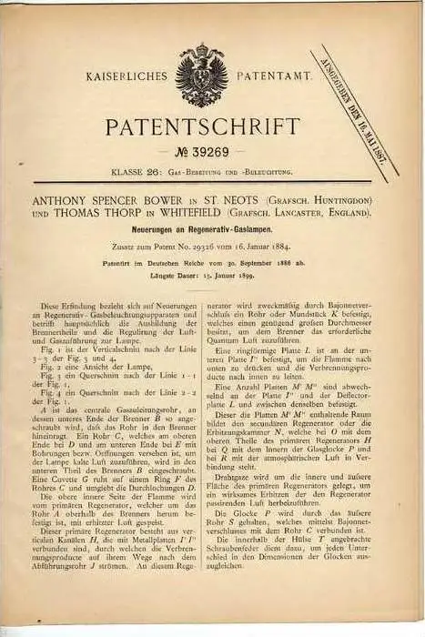 Patent: Neuerungen an Regenerativ - Gaslampen