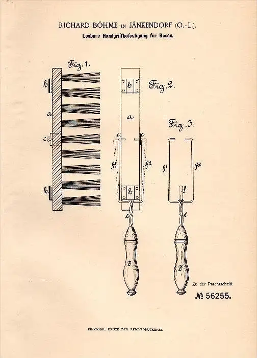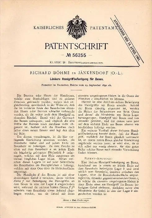 Original Patentschrift - Richard Böhme in Jänkendorf b. Görlitz , 1890 , Handgriff für Besen , Waldhufen !!!