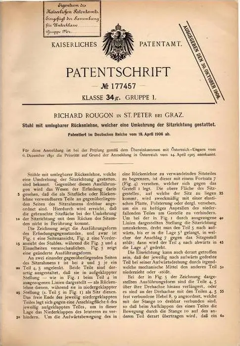 Original Patentschrift - Richard Rougon in St. Peter b. Graz , 1906 , Stuhl mit umlegbarer Rückenlehne !!!