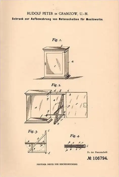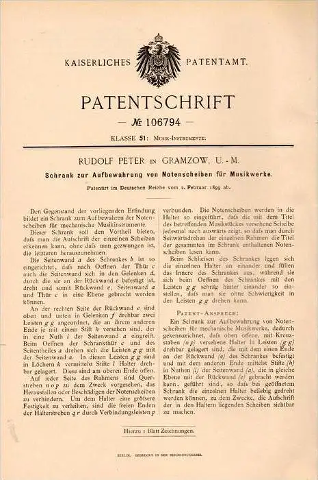 Original Patentschrift - Rudolf Peter in Gramzow , Uckermark ,1899, Schrank für Notenscheiben , Musik , Noten , Prenzlau