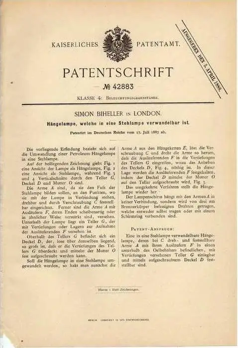 Original Patentschrift - S. Biheller in London , 1887 , Hängelampe in Stehlampe verwandelbar !!!