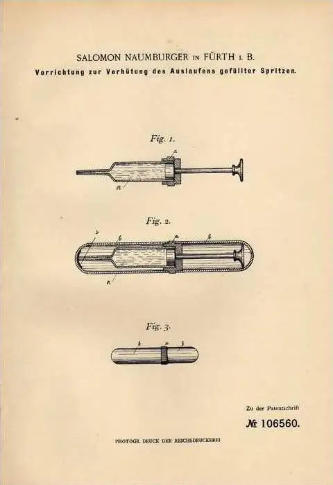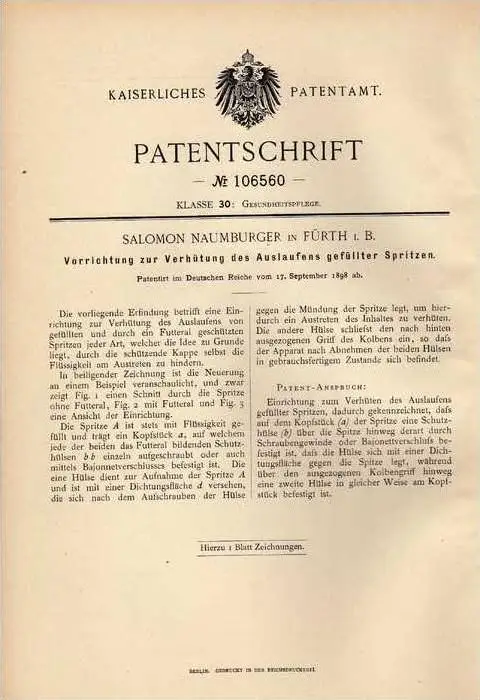 Original Patentschrift - S. Naumburger in Fürth i.B., 1898 , Spritze , Arzt , Injektion !!!