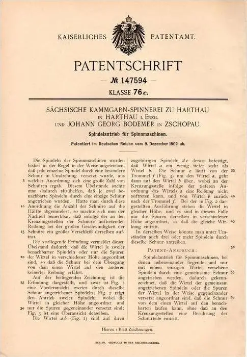 Original Patentschrift - Sächs. Spinnerei in Harthau i. Erzgeb. und Zschopau , 1902 , Spindel für Spinnmaschine !!!