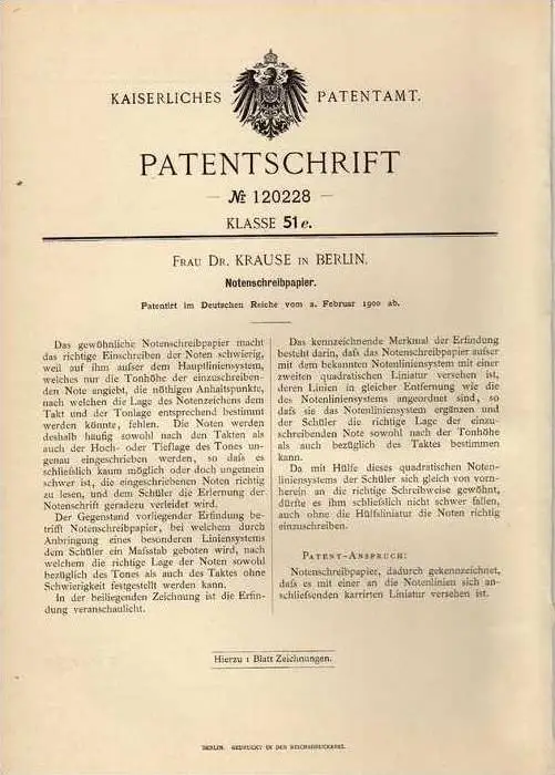Original Patentschrift - Schreibpapier für Noten , 1900 , Dr. Krause in Berlin , Musik , Komponist , Komposition !!!