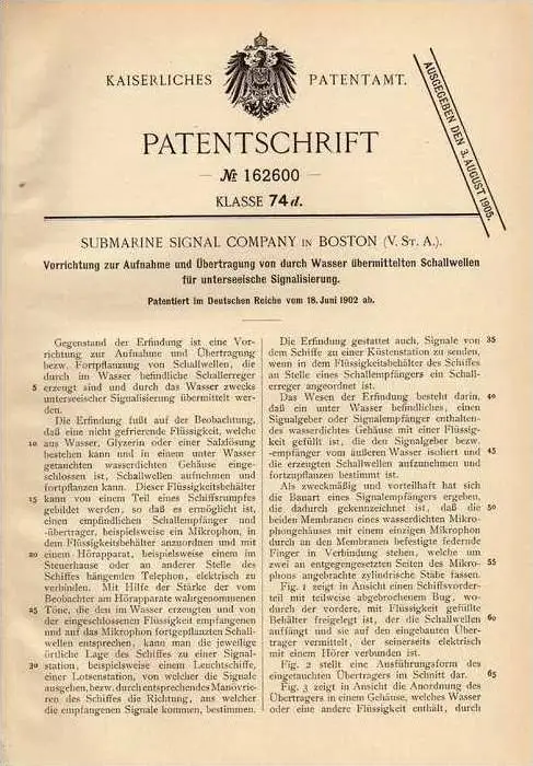 Original Patentschrift - Submarine Signal Comp. in Boston , 1902 , Signalaufnahme von Schallwellen , Echolot !!!
