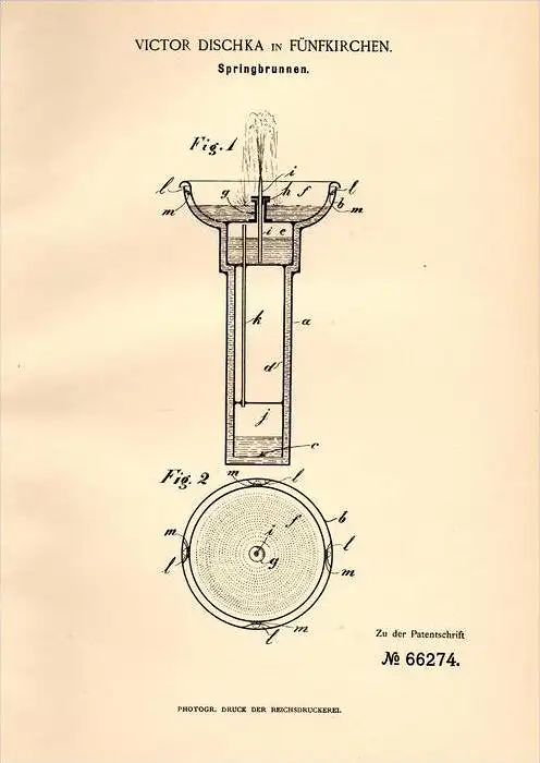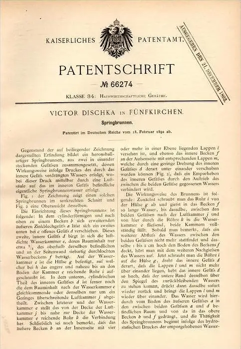 Original Patentschrift - V. Dischka in Pécs / Fünfkirchen , 1892 , Springbrunnen !!!