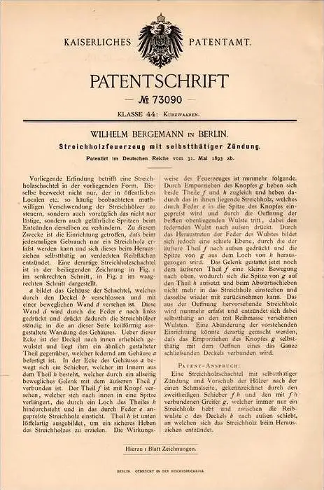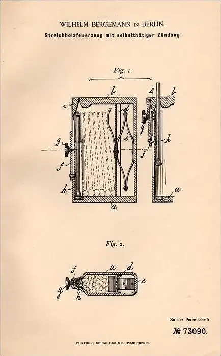 Original Patentschrift - W. Bergemann in Berlin , 1893 , Streichholz - Feuerzeug , Streichhölzer , Zündhölzer !!!