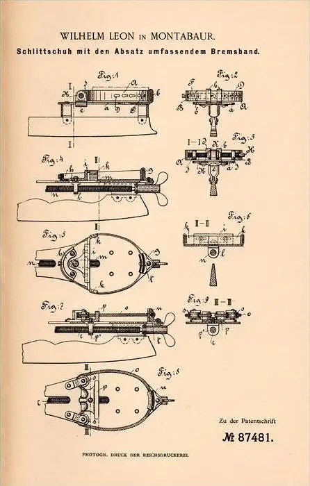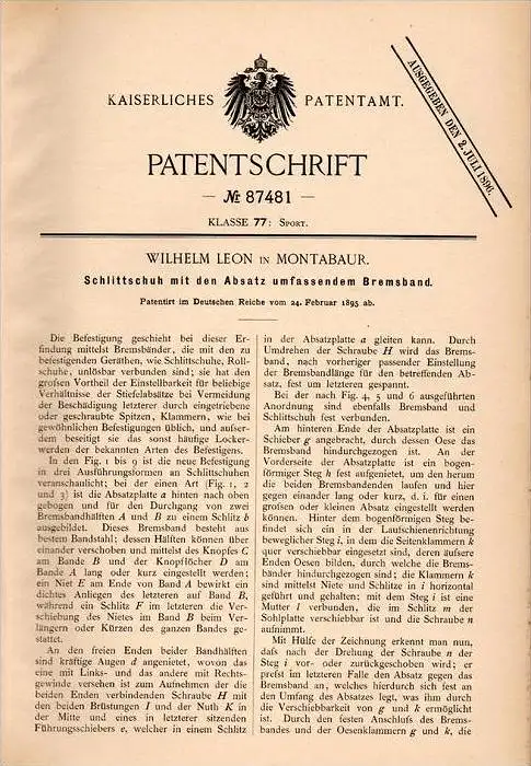 Original Patentschrift - W. Leon in Montabaur , 1895 , Schlittschuh mit Bremse , Eiskunstlauf , Wintersport !!!