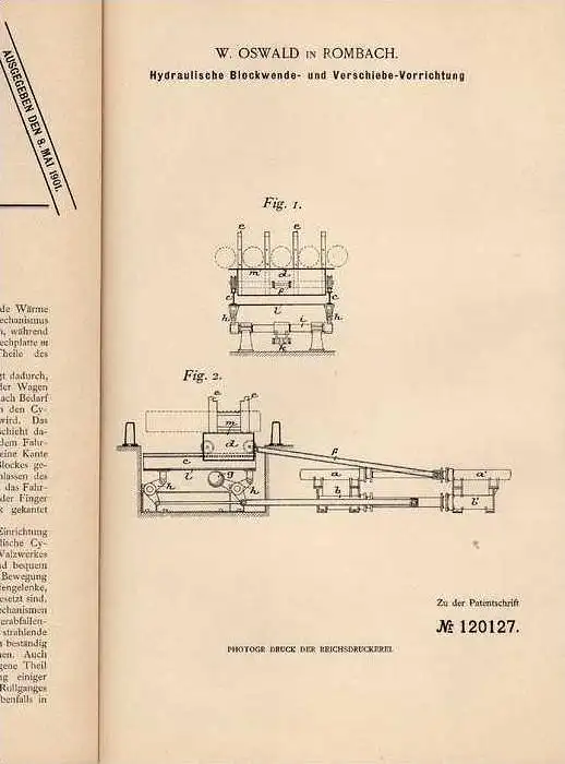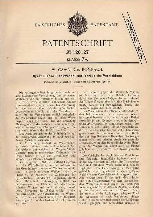 Original Patentschrift - W. Oswald in Rombach / Rombas , 1900 , Walzwerk - Vorrichtung , Moselle !!!