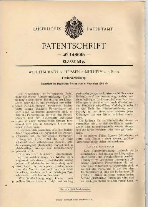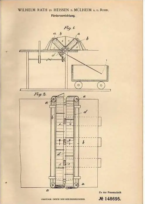 Original Patentschrift - W. Rath in Heissen b. Mülheim a.d. Ruhr , 1902 , Fördervorrichtung !!!
