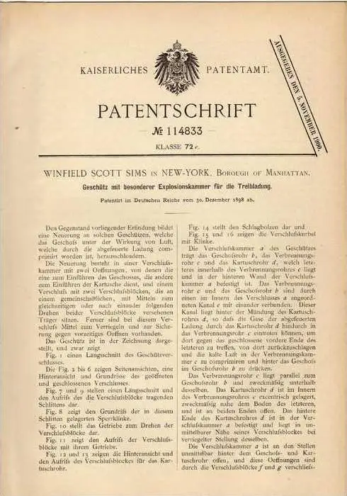 Original Patentschrift - W. Sims in New York , 1898 , Geschütz , Kanone mit besonderer Explosionskammer !!!