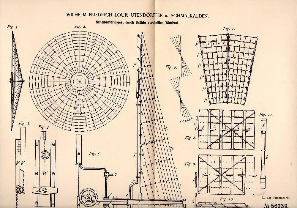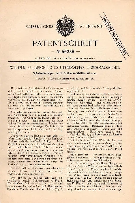 Original Patentschrift -W.F. Louis Untendörffer in Schmalkalden ,1890, scheibenförmiges Windrad , Windpark , Windenergie