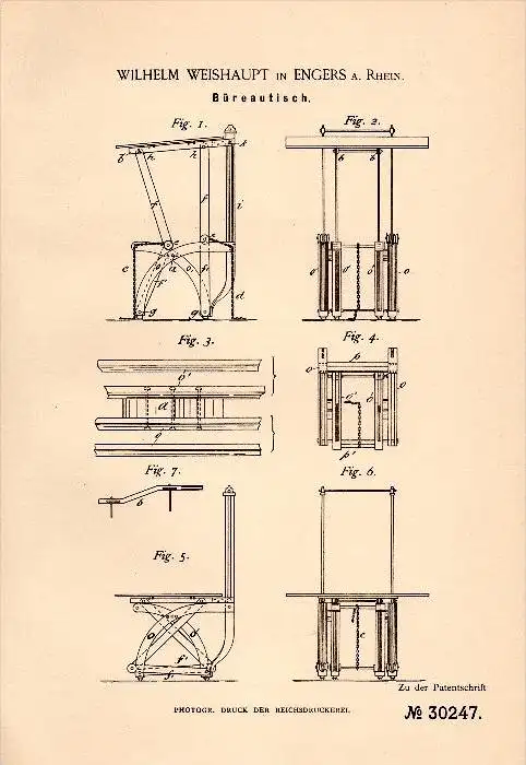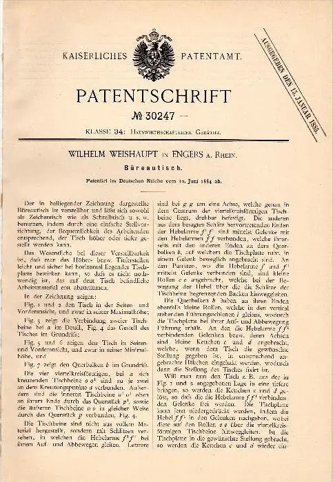 Original Patentschrift - Wilhelm Weishaupt in Engers b. Neuwied , 1884 , Bürotisch , Tisch , Möbel !!!