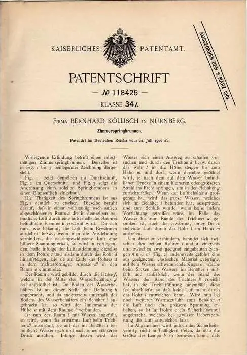 Original Patentschrift - Zimmerspringbrunnen , 1900 , Fa. Köllisch in Nürnberg , Springbrunnen !!!