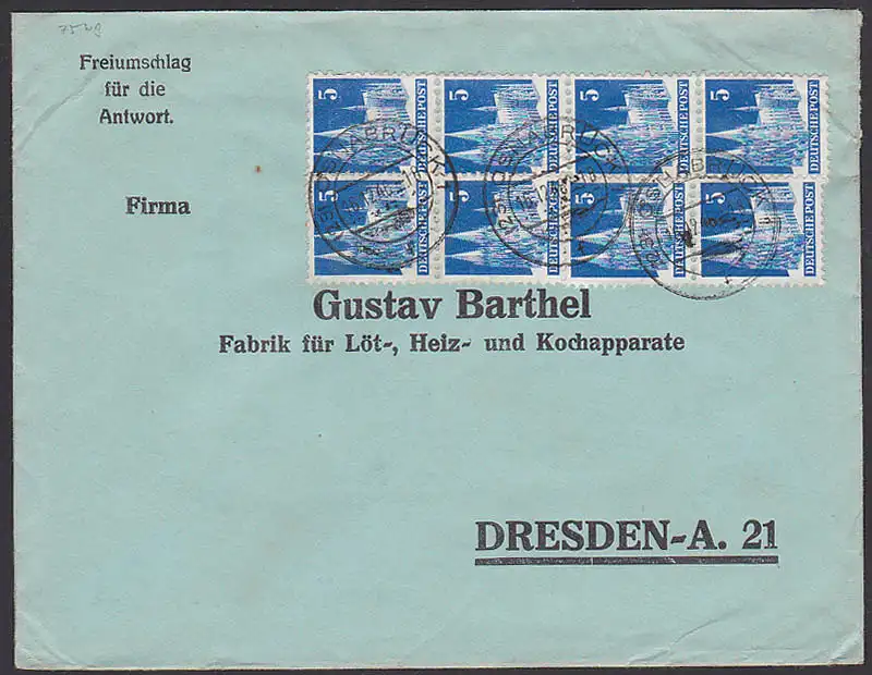 Osnabrck 16.12.48, Freiumschlag fr die Antwort, 5 Pfg. K”lner Dom in zwei 4er-Streifen (75 wg)