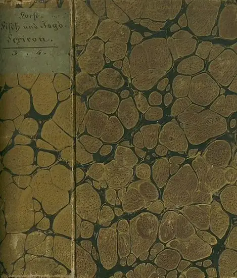 8°. Pappband der Zeit mit braun-schwarz gemustertem Buntpapierbezug, grünem handschriftlichem Rückenschild und Dreiseitengelbschnitt. Der Einband wenig berieben, Ecken gering abgenutzt und bestoßen. 12 Bl. Vorrede incl. Titel, 1064 Spalten, 1 S. Nachtrag u. Druckfehler. Mit einigen Holzschnittvignetten und -initialen. Angebunden: Stahl, J[ohann] F[riedrich]: Onomatologiae forestalis-piscatorio-venatoriae Supplementum oder Beyträge und Verbesserungen des vollständigen Forst- Fisch- und Jagd-Lexicon. 4.Band in welchem alle bey dem Forst- Floß- Fisch- und Jagdwesen vorkommende Kunstwörter erkläret [...] werden etc. Nebst einer Vorrede von [...] Hölzern und Waldungen. 8 Bl. Vorrede incl. Titel, 1120 Spalten. Mit 3 Holzschnittvignetten. Schönes Exemplar, beide Teile in absolut fleckenfreiem Bestzustand