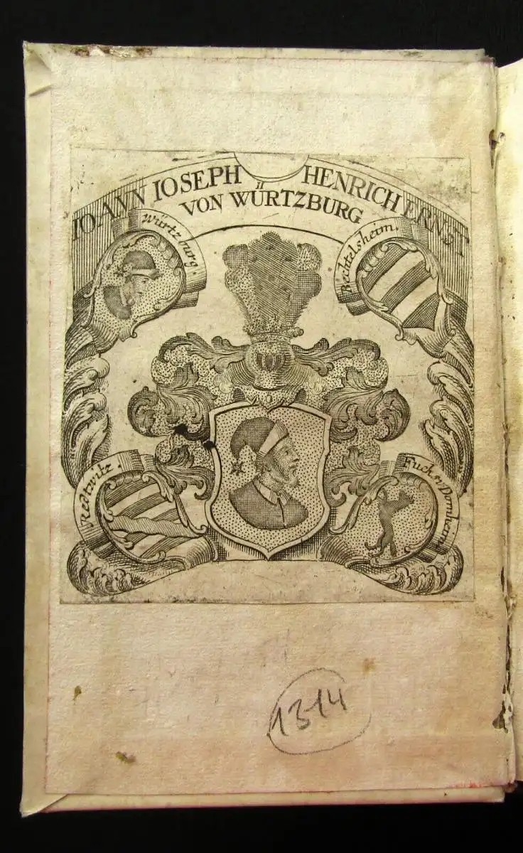 Einband berieben und bestoßen, Rücken an einer Stelle defekt, hs. Rs., roter Rundumschnitt, Wappenexlibris auf Spiegel, Spiegel leicht fleckig, Papier mit leichtem Wurmfraß und minimalst gebräunt