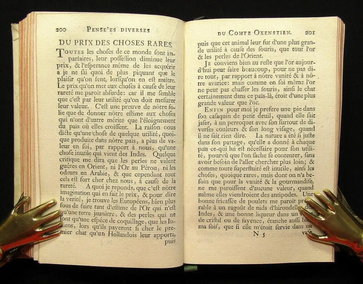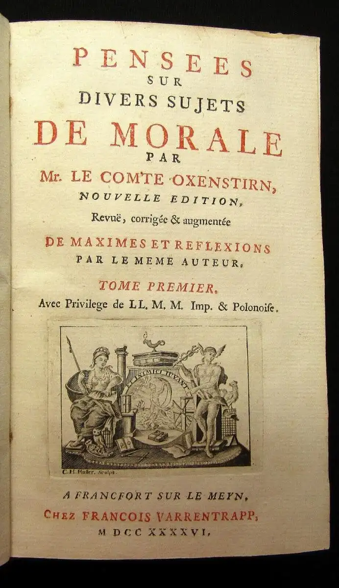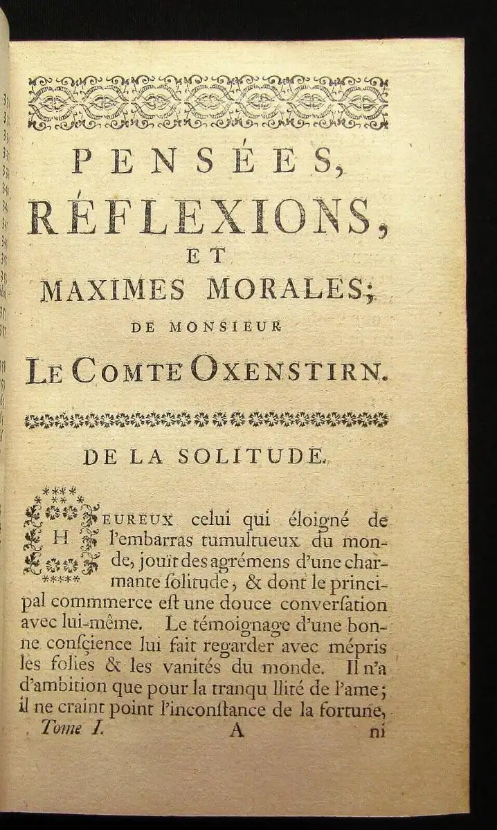 Nouvelle Edition. 2 Bde. Mehrfach aufgelegte und auch ins Deutsche übersetzte Betrachtungen des großen Axel Oxenstierna, aufgezeichnet von seinem Neffen, Johann Thuresson Oxenstierna. Die Gedanken und Reflexionen drehen sich u.a. um: Freundschaft, Faulheit, Karneval, Italien, Freude, Trauer und vieles mehr.