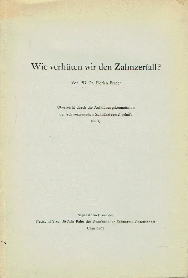 guter bis sehr guter Zustand, geringe Gebrauchs- und Alterungsspuren: Papier teils etwas vergilbt, aber Seiten sauber und ordentlich - untere Ecke der Rückseite geknickt, Die Bevölkerung der Schweiz leidet stark an Zahnzerfall. Fast jeder von uns muss sich der periodischen zahnärztlichen Sanierung mit all ihren psychischen und physischen Unannehmlichkeiten unterziehen, wenn er seinen Zahnbestand erhalten will. Kann man bei der Karies von einer Volksseuche sprechen? Wie gross ist der Zahnzerfall? In einer Basler Dissertation vom Jahre 1940 wird bei Schulkindern im Kanton Appenzell eine Kariesfrequenz von 34,5% mit 99,18% kranken Gebissen angegeben. Auch in Zürich sind 30,3% Zähne kariös zerfallen bei 96,6% kranken Gebissen. Ja selbst in abgelegenen Alpentälern ist eine relativ hohe Kariesanfälligkeit, findet doch Roos bei den Gomser Kindern im Wallis 14% Karies. Auch in andern Ländern ist die Karies ebenso stark verbreitet. Dass die Menschheit nicht immer diesen erschreckenden Zahnzerfall kannte, belegen die Untersuchungen aus der Steinzeit mit einer Kariesfrequenz von 1,6% Karies mit nur 15% kranken Gebissen. Diese Zahlen zeigen, dass wir sehr wohl berechtigt sind, von einer Volksseuche zu sprechen, auch wenn die Zahnverhältnisse bei der behandelten Jugend sich stark gebessert haben. Dank dem hohen Standard der schweizerischen zahnärztlichen Institute, kartoniert, ca. 15,5 x 22,5, 50 Seiten mit 5 Abbildungen