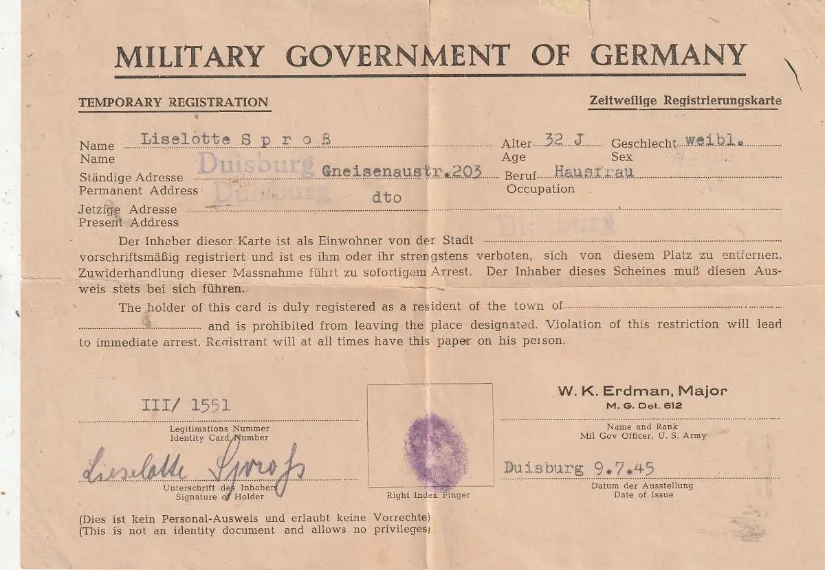 DOKUMENT - AUSWEIS, PERSONALAUSWEIS / ZEITWEILIGE REGISTRIERUNGSKATE US ARMY, Duisburg 09.07.1945