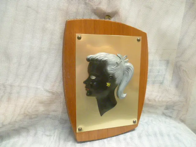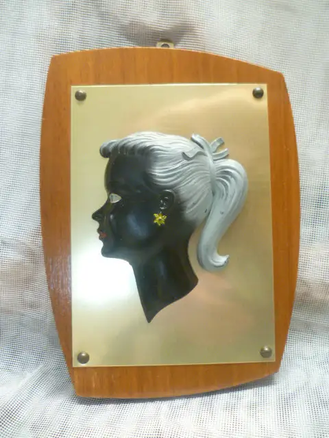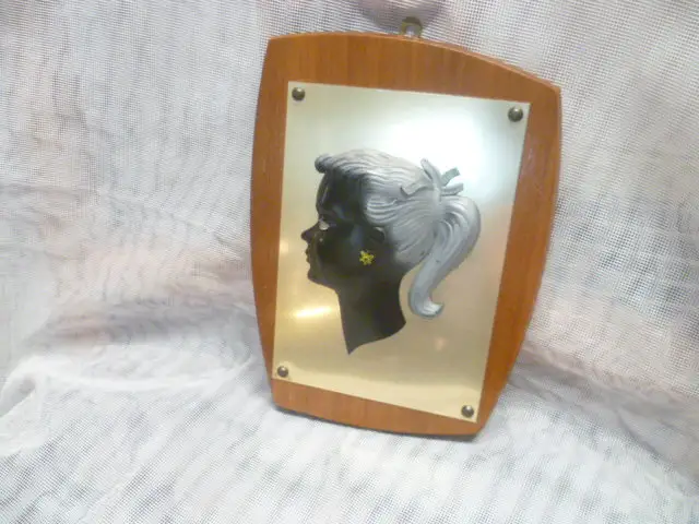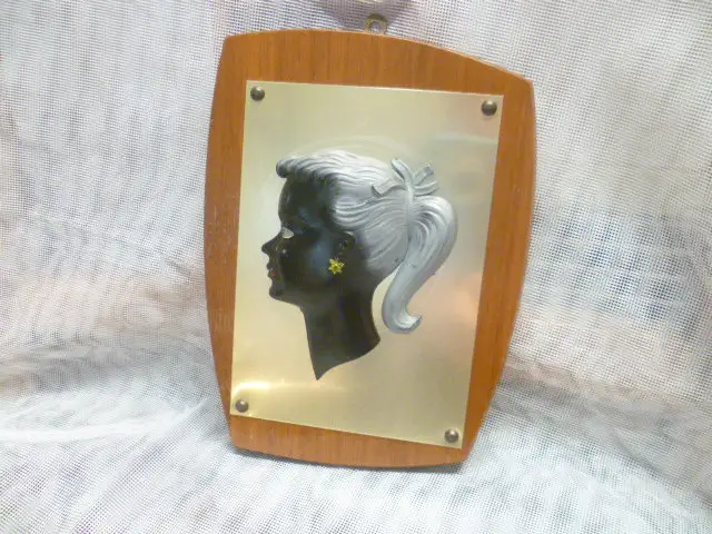 PETTICOAT ÄRA Vintage 1950/60 " Mädchen" kleines Wandbild auf Teakholzplatte Messingplatte mit dreiviertel Mädchen Bakalit ?