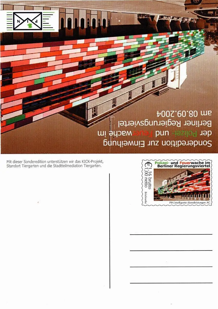 • MichSeite PIN AG: MiNr. KB 6, 08.09.2004, "Einweihung der Polizei- und Feuerwache im Berliner Regierungsviertel", Ganzsache (Postkarte), ungebraucht Beschreibung \nPostdienstleister: PIN AG, Berlin \nAusgabeanlass: Ganzsachenausgabe "Einweihung der Polizei- und Feuerwache im Berliner Regierungsviertel" Katalognummer: MiNr. KB 6 Ausgabedatum: 08.09.2004 Nominale: Satz (1 Ganzsache) zu 1,16 EUR (0,41 + 0,75 EUR) \nTyp: - \nErhaltung: Klappkarte, ungefaltet, ungebraucht \nHinweis: Sonderedition zur Unterstützung des KICK-Projektes Thema: Rettung, KICK Tiergarten