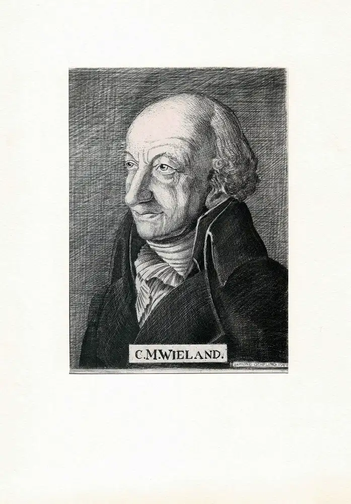 Nach dem Ölgemälde von Ferdinand Jagemann (1805). - Entstanden für die "Hamburger Reprintausgabe" der "Sämmtliche(n) Werke" des Dichters, Herausgebers u. Übersetzers Christoph Martin Wieland (1733-1813), eines der bedeutendsten dt. Vertreter der Aufklärung u. Angehöriger des Weimarer Viergestirns (mit Goethe, Schiller, Herder), Hamburg u. Nördlingen, Greno, 1984