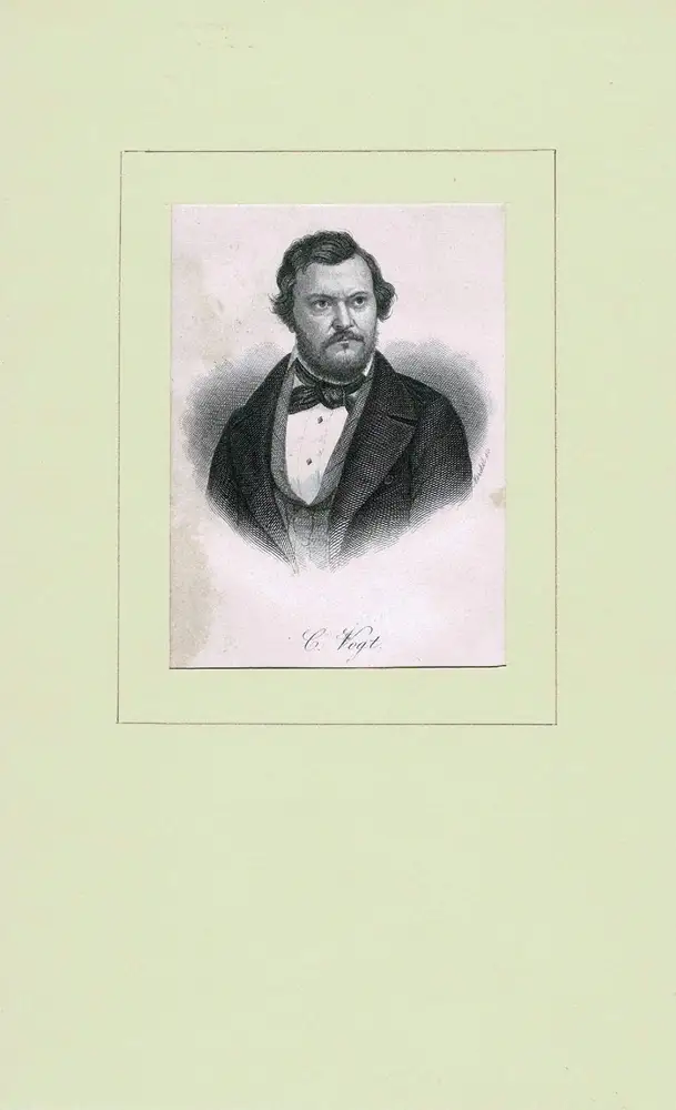 Vogt war Professor für Zoologie in Gießen, radikaldemokratischer Abgeordneter in der Frankfurter Nationalversammlung u. lehrte ab 1852 als Professor für Geologie, ab 1872 als Professor für Zoologie in Genf. - Rund um die Darstellung braunfleckig