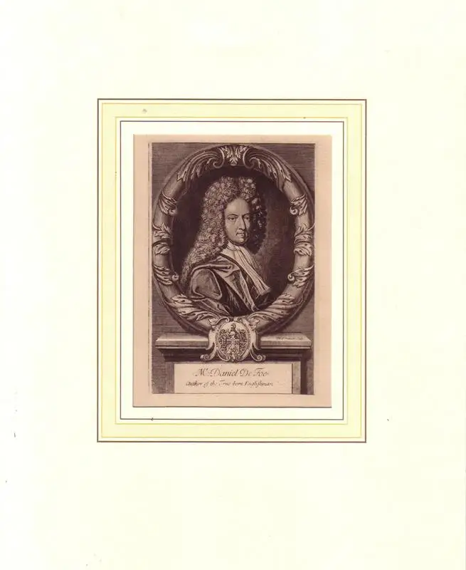 PORTRAIT Daniel Defoe. Brustbild im Dreiviertelprofil, umgeben von ornamentalem Rahmen mit Wappen auf einem Sockel mit Inschrift. Heliogravüre nach einem Kupferstich, Defoe, Daniel