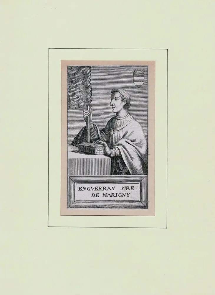 Der Porträtierte steht in weitem Umhang hinter einem Tisch, an seiner linken Seite ist der Griff eines Schwertes oder Degens zu erkennen, die linke Hand ruht auf einer kleinen Schatulle, mit der leicht erhobenen Rechten hält er das französische Lilien-Banner. Unterhalb des Porträts die Bildbezeichnung. - Enguerrand de Marigny (um 1260-1315), Kammerherr des französischen Königs Philipp IV., später auch Minister, wurde von Philipps Nachfolger Charles de Valois hingerichtet (Encycl. Brit., 11. Aufl., Bd. 17, S. 718). - Knapp beschnitten