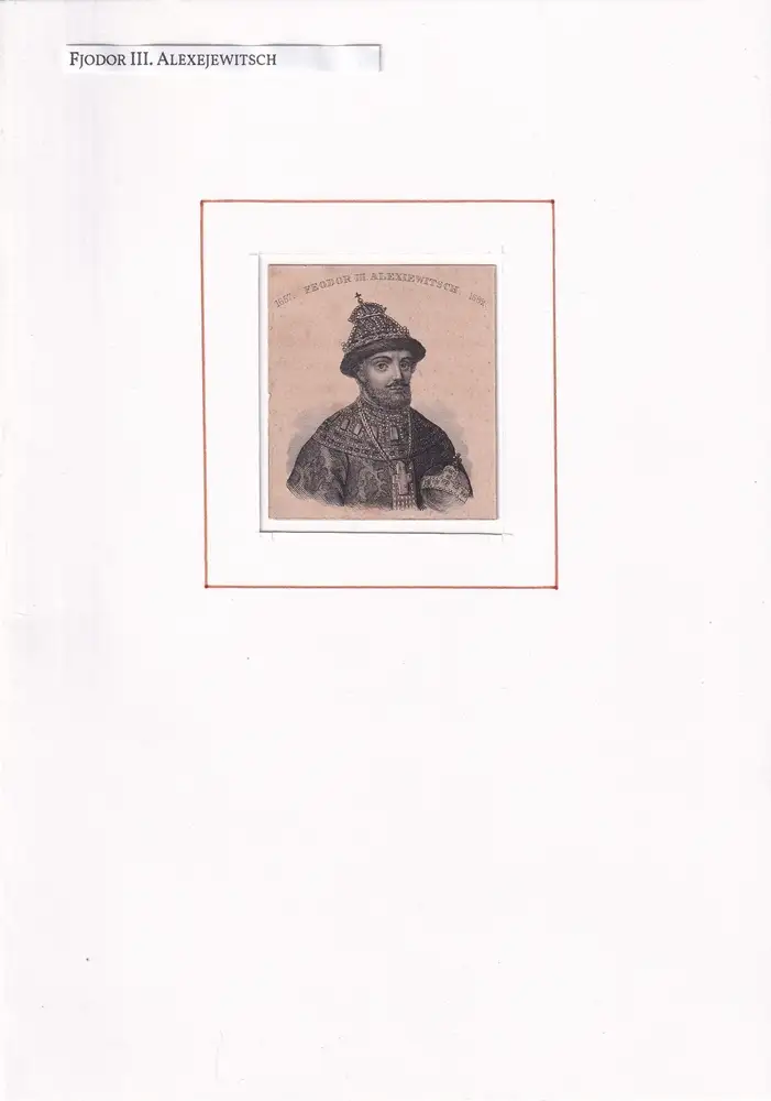 Miniatur-Porträt. - Fjodor III. Alexejewitsch, Halbbruder Peters des Großen, war 1676-1682 Zar u. Großfürst des Moskauer Reiches. Der von Kindheit an kränkliche Zar begann viele Reformen, jedoch konnten die meisten davon aufgrund seiner kurzen Regentschaft nicht zu Ende gebracht werden. Sie hatten außerdem eine Verschlechterung der Lage des Volkes zur Folge, die zum Moskauer Aufstand von 1682 u. zur Übernahme der Regentschaft durch Fjodors Schwester Sophia Alexejewna (Sof'ja Alekseevna) führte. - Gebräunt