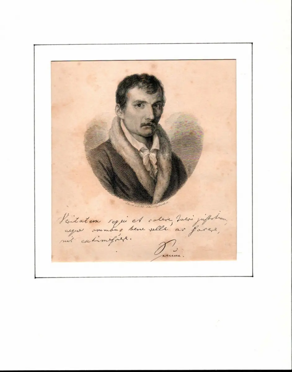 PORTRAIT Johann Gottfried Seume. Brustbild im Dreiviertelprofil, nach rechts blickend, mit faksimilierten Zitat und Unterschrift darunter. Stahlstick von Schwerdtgeburth nach Schnorr von Karolsfeld