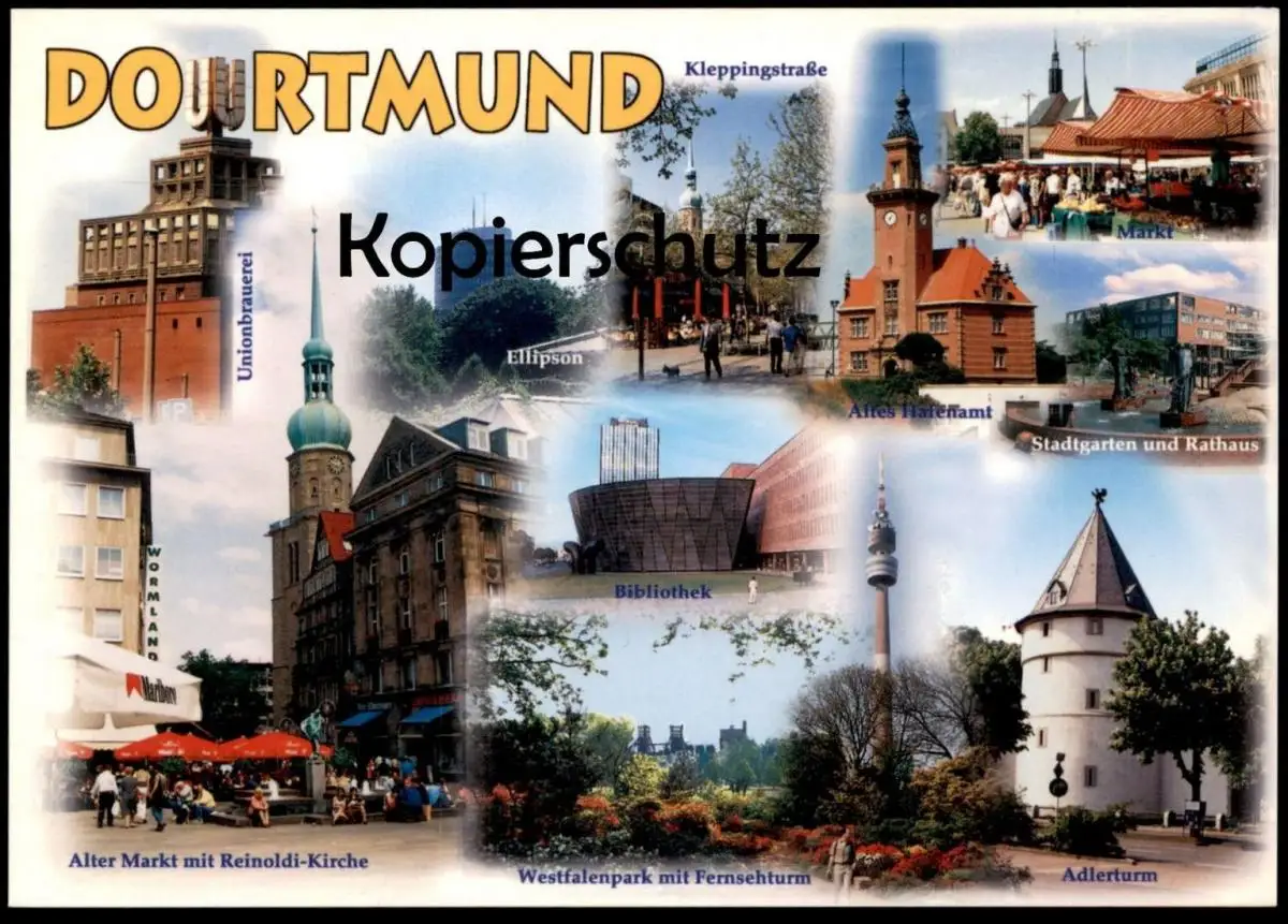 POSTKARTE DORTMUND BIBLIOTHEK ELLIPSON MARKT UNIONBRAUEREI ALTES HAFENAMT KLEPPINGSTRASSE STADTGARTEN UND RATHAUS ADLERTURM ALTER MARKT MIT REINHOLDI-KIRCHE WESTFALENPARK MIT FERNSEHTURMVerlag: type art satz & grafik, dortmund