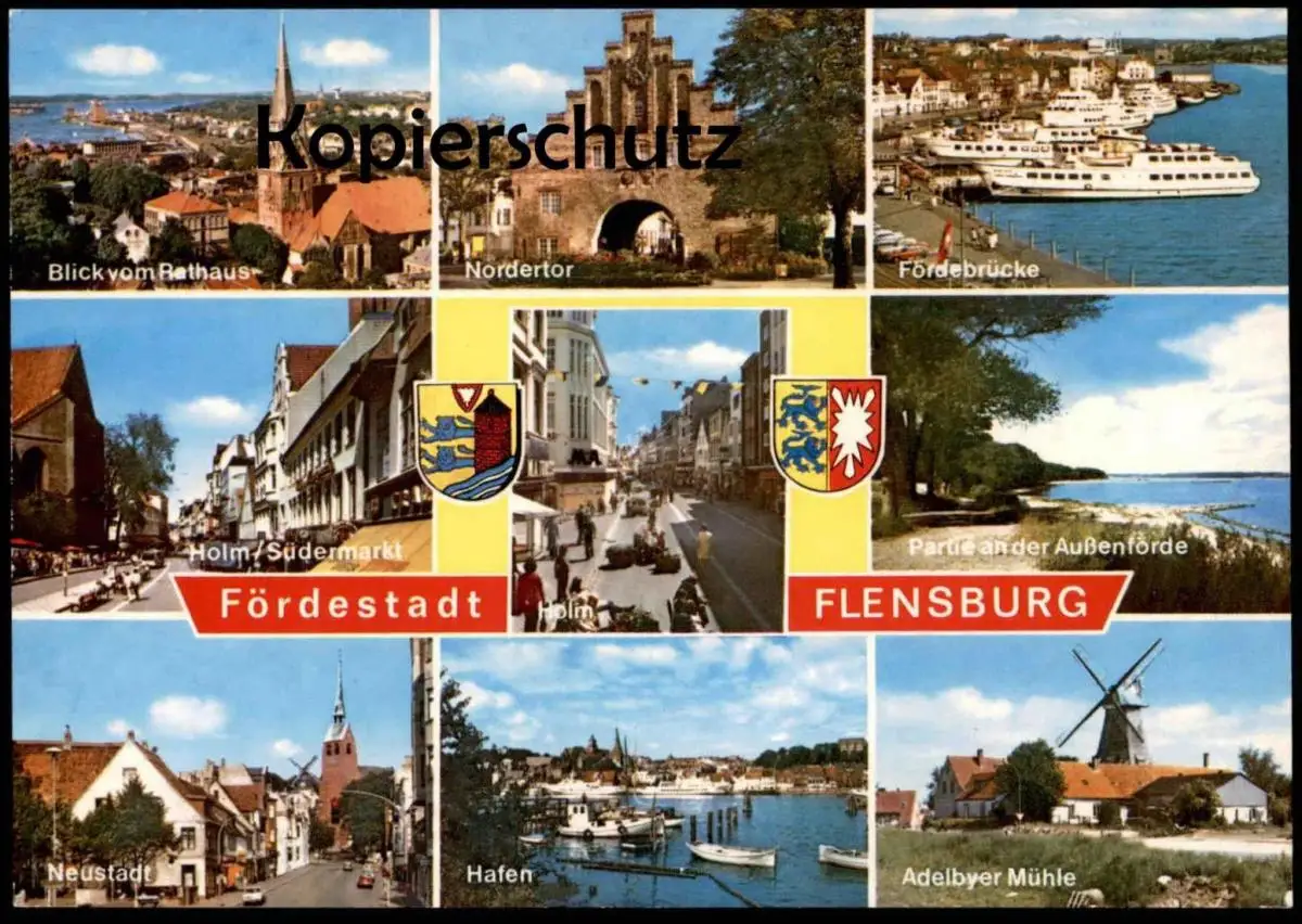 ÄLTERE POSTKARTE FLENSBURG HOLM SÜDERMARKT HAFEN NEUSTADT FÖRDEBRÜCKE NORDERTOR ADELBYER MÜHLE PARTIE AN DER AUSSENFÖRDE BLICK VOM RATHAUS