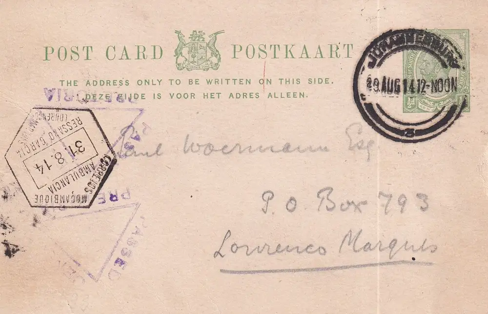 Seitenanzahl: Vorderseite mit gedruckter Frankierung sowie Poststempeln Johannesburg 29. Aug. 14 u. Correios Mocambique Ambulancia 31.8.14 u. 2 Stempeln "Passed Cens[ur] Pretoria", beidseitig mit Bleistift beschrieben. (9 x 14 cm)