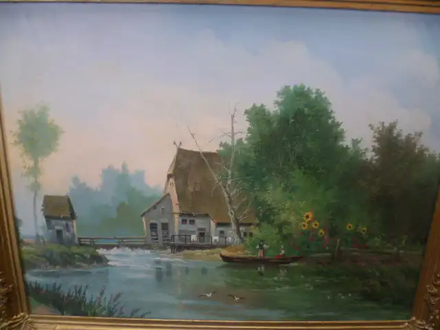 Impressionistisches Gemälde "Fischer an einer Wassermühle Sommer"