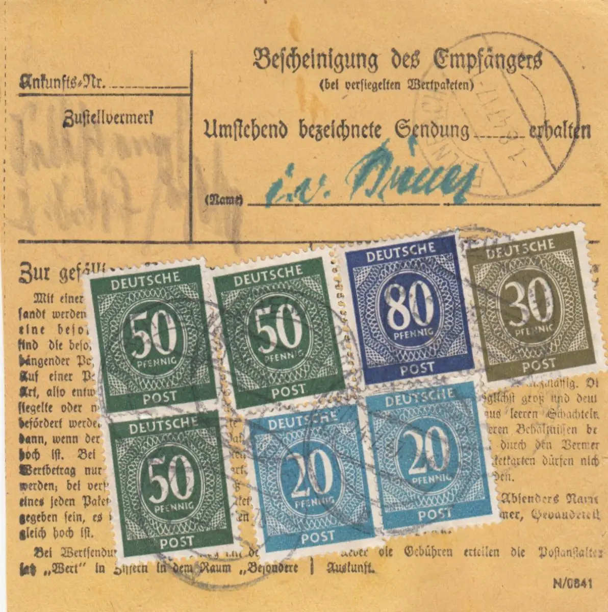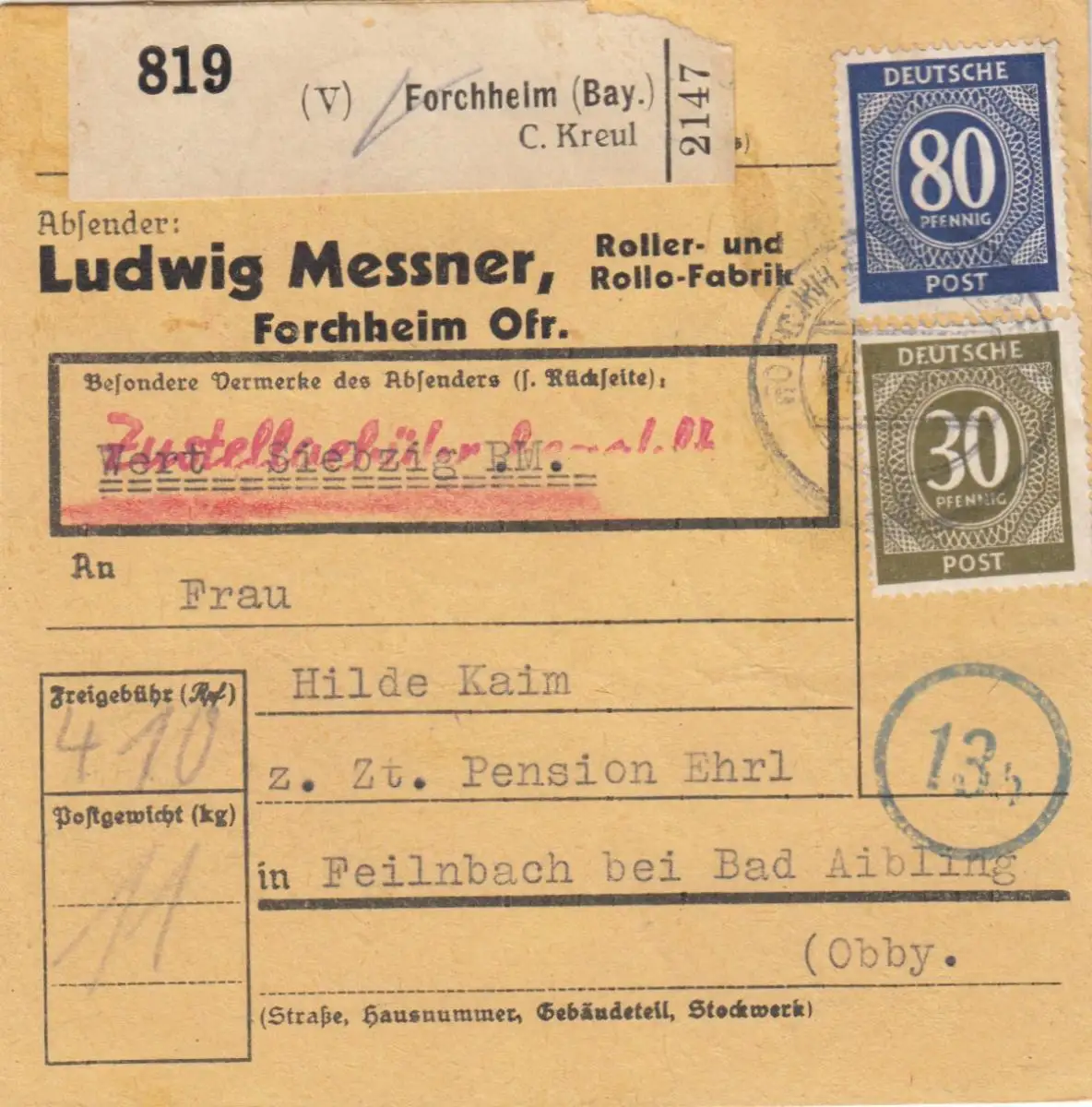Carte de paquet 1947: Forchheim vers Feilnbach, carte de valeur, auto-réservation